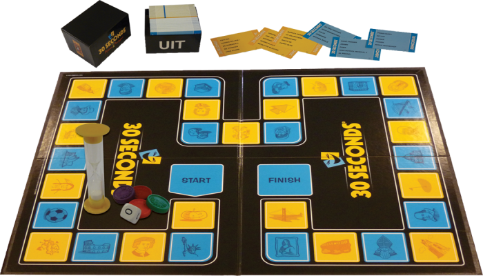 Tja, wie kent 30 Seconds nou niet? Je speelt in teams, waarin je binnen 30 seconden zoveel mogelijk van de vijf begrippen op je kaartje probeert te omschrijven. Zonder de naam zelf te noemen. Hoe meer begrippen je team binnen die tijd raadt, hoe meer veldjes je vooruit mag op het spelbord. Van legendarische muziekalbums tot voetbalclubs: wie gaat als eerste over de finish? Lees meer