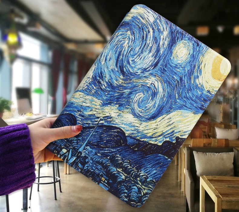 Hier zie je een case voor je iPad waarvan de opdruk is, laten we zeggen ‘geïnspireerd’, op Vincent van Gogh’s beroemde ‘Sterrennacht’. De achterkant van de case is net als bij het bovenstaande geval een transparante hard case.