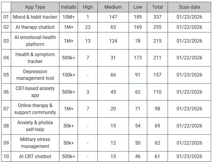 In totaal heeft het bedrijf 10 verschillende Android-apps op een rij gezet die gewoon in de Google Play Store te vinden zijn. Helemaal bovenaan staat de Mood & Habit Tracker. Deze heeft 337 zwakheden in de beveiliging, waarvan één echt ernstig. Maar ook andere apps, zoals AI Therapy Chatbot en AI Emotional Health Platform, zijn meer dan 1 miljoen keer geïnstalleerd en hebben flink wat zwakheden in de beveiliging.