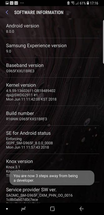 Voordat je bij de developer opties kunt, moet je eerst een developer worden. Niet echt natuurlijk, maar wel voor je toestel. Hiervoor duik je de settings in en kies je voor “About device” of “About Phone”. Zoek in dit menu naar “Build number”. Het kan dat het bouwnummer verborgen zit onder een ander menu, zoals “Software information”. Als je Build number hebt gevonden, tap je daar een paar keer op. Je krijgt dan een popup, waarin je wordt verteld dat je nog een paar stappen verwijderd bent van het worden van een Developer. Tap gerust verder en voila.