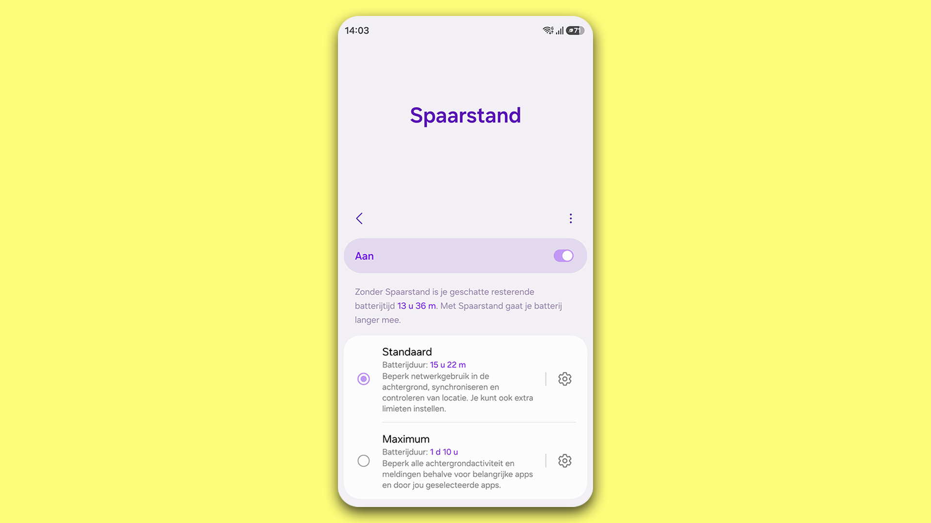 Maar waar de echte saus zit, is de Maximum of Extreme spaarstand. Deze vind je door de toggle van je spaarstand ingedrukt te houden en staat dan vaak onder de standaard spaarstand. Wat deze modus doet is het compleet beperken van al je achtergrondactiviteiten. Dat is belangrijker dan je denkt, want ondanks dat je geen apps draait, gebeurt er enorm veel op de achtergrond van je Android dat op den duur batterij slurpt.