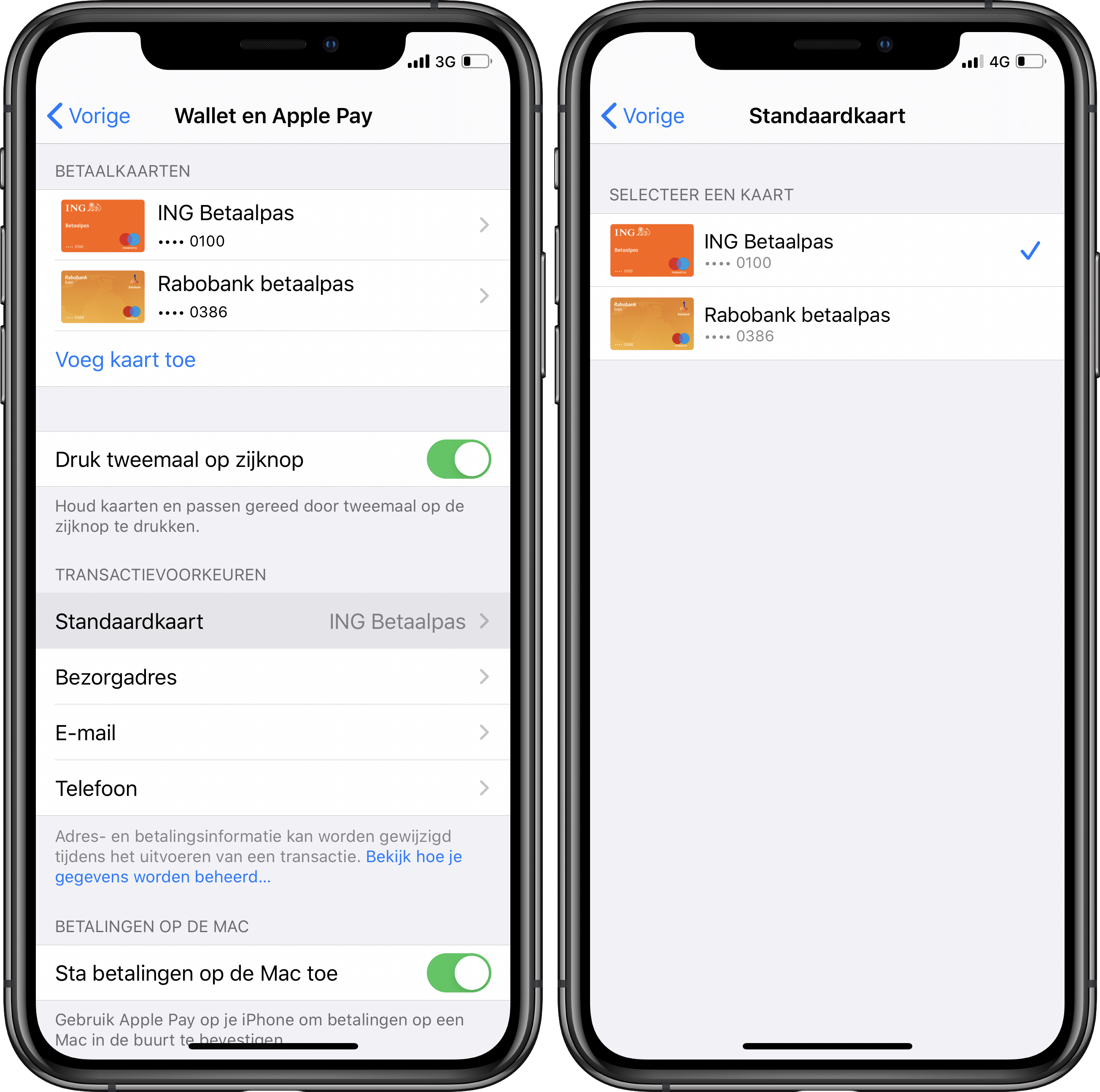 Daarna is het mogelijk om een standaardkaart in te stellen. Dat is handig als je zowel een particuliere als zakelijke rekening hebt, of bij meerdere banken zit. Dit doe je via het menu Instellingen > Wallet en Apple Pay > Standaardkaart.