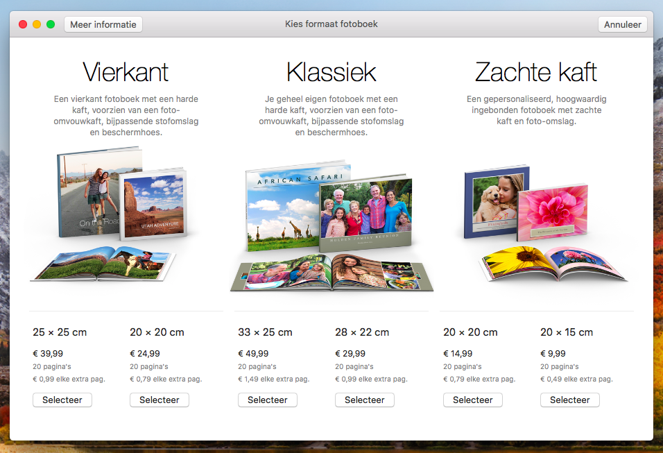 Apple’s dienst nog een keer gebruiken? Dat kan tot 30 september. Voor een fotoboek met zachte kaft vraagt Apple € 9,99. Een hardcover-boek is verkrijgbaar vanaf € 29,99. Grotere formaten zijn leverbaar voor een meerprijs. Andere producten zijn ook te koop. Zo kan je een kalender bestellen voor € 19,99 per stuk, kaarten beginnen bij € 0,99 en posters voor panoramische opnamen zijn ook beschikbaar voor € 12,99. Deze prijzen blijven ongewijzigd totdat de service in de herfst wordt beëindigd.
