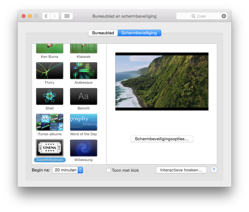 Met SaveHollywood is het mogelijk om een of meer videobestanden als screensaver op je Mac te gebruiken. Je kunt de applicatie hier downloaden. Na het downloaden en installeren verschijnt SaveHollywood in de lijst met screensavers bij Systeemvoorkeuren → Bureaublad en schermbeveilging. Daar kun je de .mov-bestanden toevoegen.