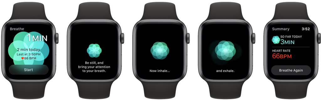 Ingebouwd in watchOS van de Apple Watch is de Breathe app. Het klinkt aan de naam heel simpel, maar het is wel degelijk bewezen dat de techniek je stress kan verminderen. De app meet op wanneer je in en uit ademt. Daarnaast houdt de software ervan ook je hartslag in de gaten tijdens kleine sessies die maar één minuut lang duren.