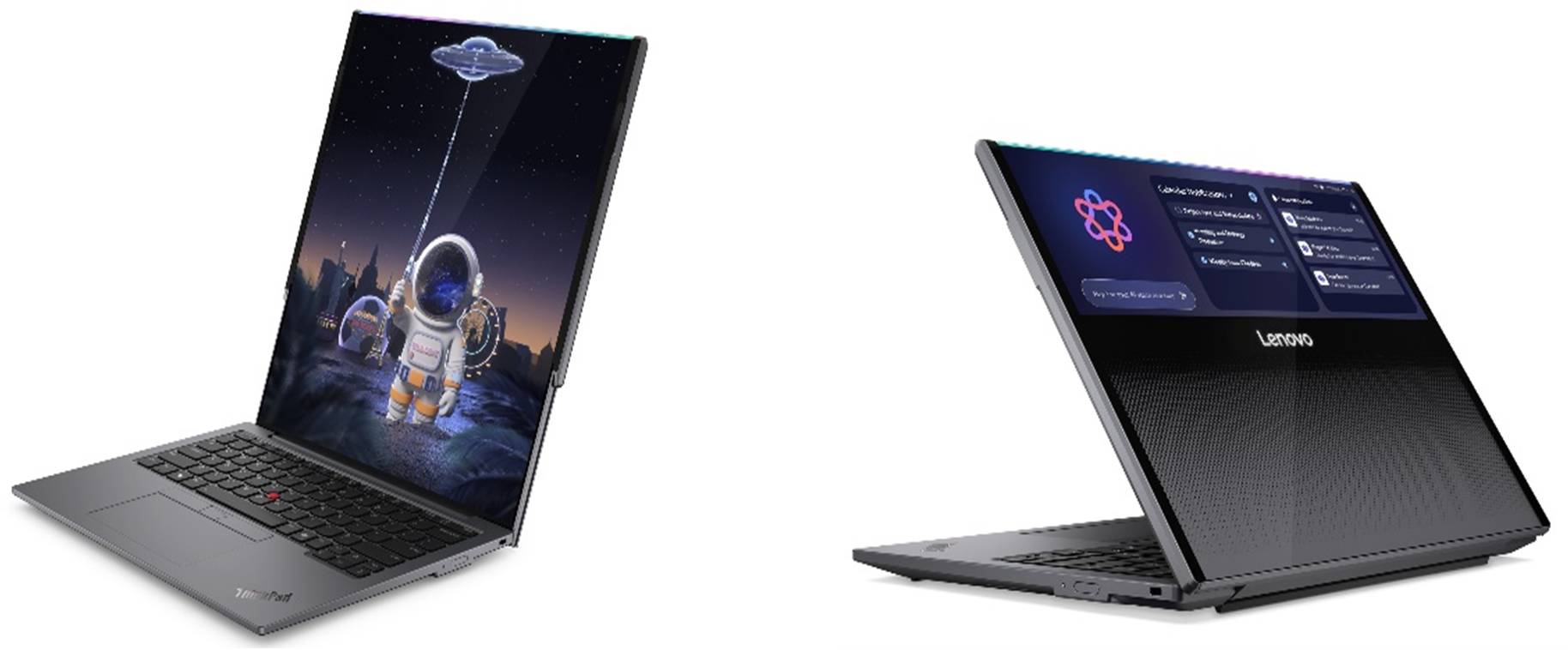 De Lenovo ThinkPad Rollable gaat een heel andere richting op, letterlijk. Het scherm rolt namelijk naar boven uit, waardoor je een groot, verticaal scherm krijgt. Hiermee kun je bijvoorbeeld twee 16:9-vensters onder elkaar zetten of optimaal genieten van TikTok-filmpjes. Ook interessant is dat het scherm over de achterkant van de laptop rolt. Dus als je het scherm weer inrolt, zit deel van het scherm aan de achterkant, waarop je weer informatie kunt afbeelden.