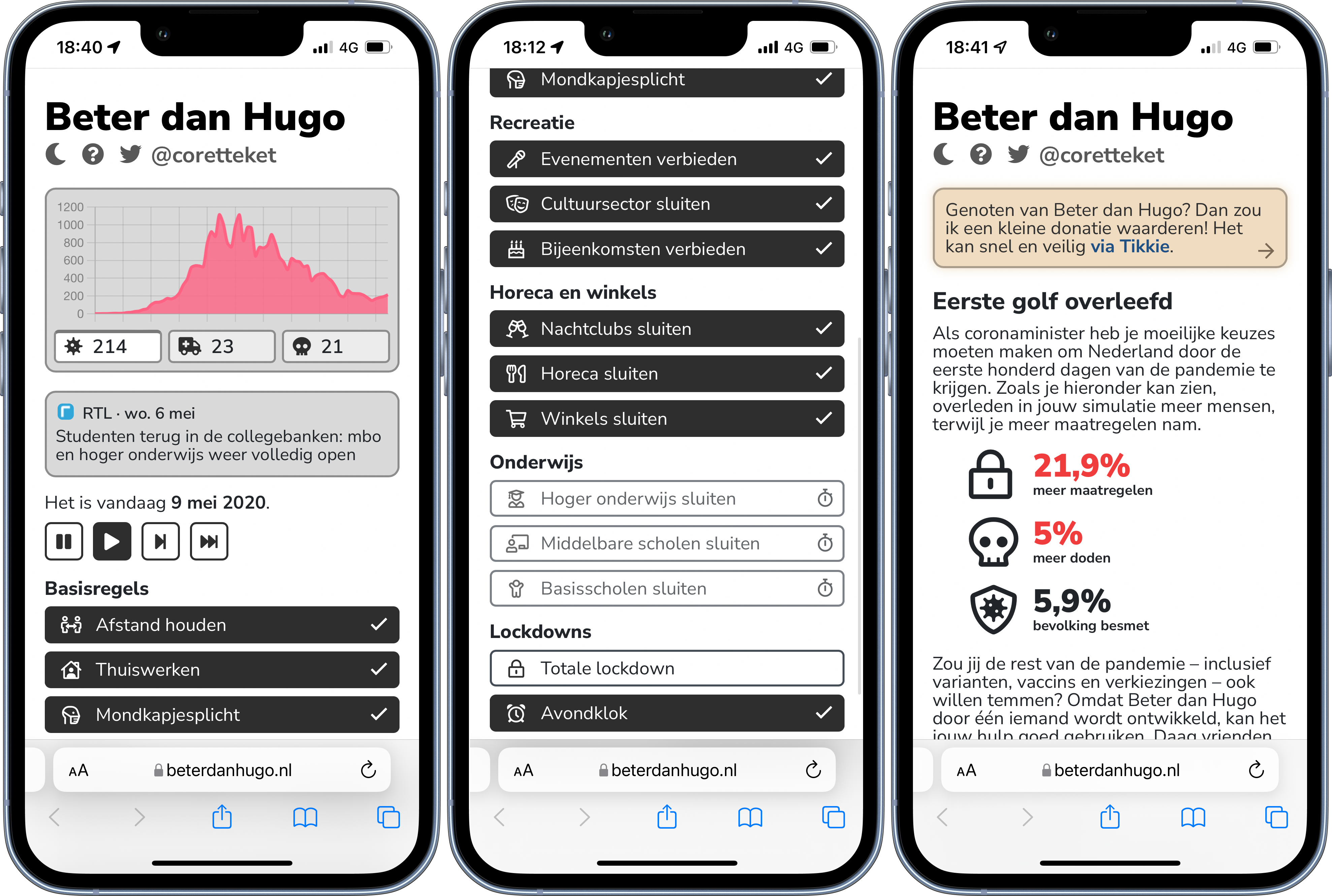 De game heeft de toepasselijke naam Beter dan Hugo en is gemaakt door de 17-jarige student Quinten Coret. In de game kun je vanaf 28 februari 2020, toen de eerste coronabesmetting in Nederland gemeld werd, zelf maatregelen invoeren. Je ziet realtime de impact van die maatregelen. Want sprak de maker van het spel.
