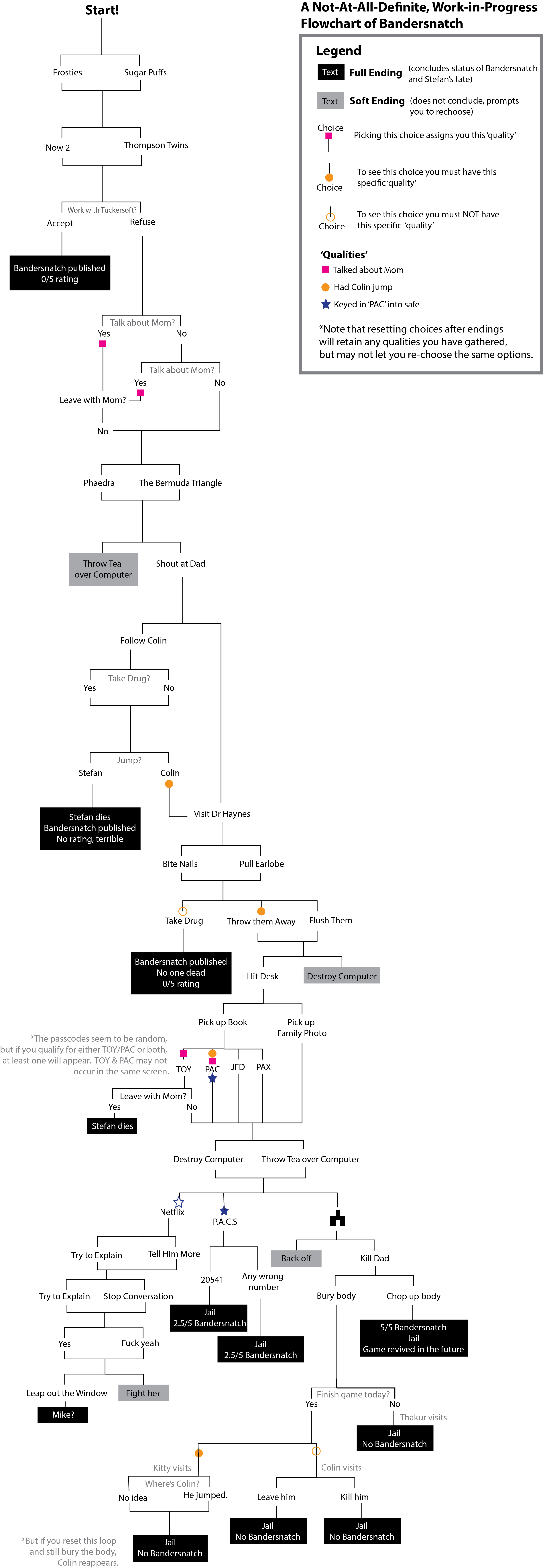 Omdat er zoveel keuzemomenten zijn, is het frustrerend om Black Mirror: Bandersnatch tientallen keren te kijken puur en alleen omdat je een ander einde wilt zien. Gelukkig hebben andere fans dat werk al voor je gedaan. Het resultaat is de onderstaande afbeelding, die logischerwijs propvol met spoilers zit.