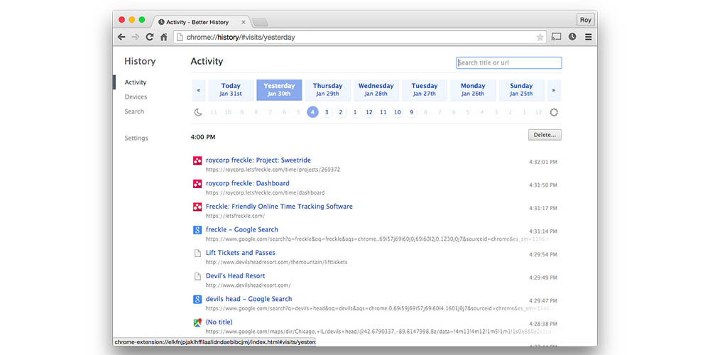 Better History geeft je wat meer tools en overzichtelijkheid als je je Chrome geschiedenis in wilt duiken. Zo kun je makkelijk springen naar een bepaalde dag of zelfs je bezoekjes per uur bekijken. Hiervoor krijg je onder andere een overzichtelijke horizontale balk bovenaan om snel naar een bepaalde datum te gaan. Soms weet je natuurlijk ook niet meer precies op welke dag je iets hebt bekeken en in dat geval kun je ook gebruik maken van verschillende filters om je zoektocht tot een succesvol einde te brengen. Overigens is het met de extensie ook makkelijker dan ooit om gegevens van een bepaald uur of een bepaalde dag weer te wissen. Mensen hoeven tenslotte ook alweer niet alles over je te weten.