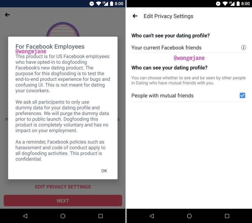 Tijdens zijn jaarlijkse F8-conferentie in mei zei Facebook al te werken aan de dienst. Inmiddels kunnen medewerkers die dienst testen, maar het is nog geen echte datingdienst voor medewerkers. Ze worden aangemoedigd om profielen met ‘fake’ gegevens aan te maken. Deze nep-profielen zullen overigens bij de publieke lancering van de applicatie worden verwijderd. Het doel is vooral bugs vinden en verwarrende elementen in de interface te vinden. Hier zijn de eerste screenshots.