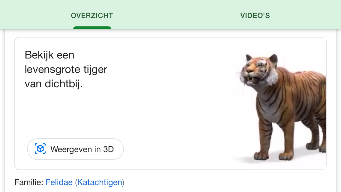 Nu heb je al een bewegende tijger die je van alle kanten kunt bekijken, maar het wordt nóg leuker. - Tap linksonder op de button ‘Weergeven in 3D’.