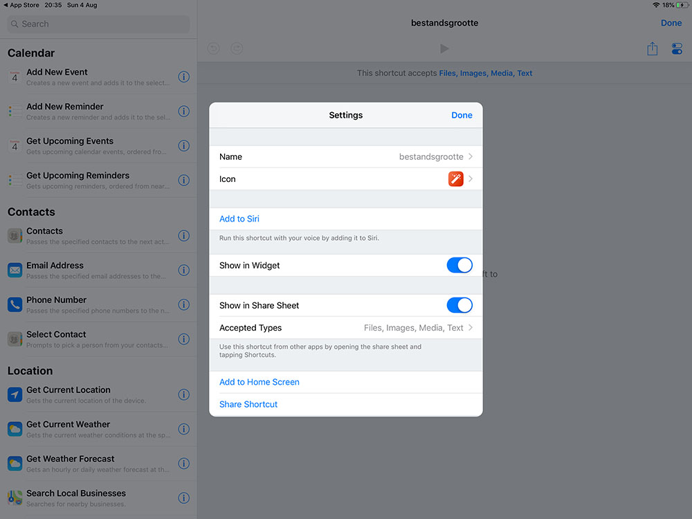 Vervolgens open je de app en kies je voor het plusje om een nieuwe shortcut te creëren. Daarna duik je de settings in met het icoontje rechtsboven en bedenk je een naam voor je snelkoppeling. Ga bijvoorbeeld voor iets als “bestandsgrootte”. Als je een naam hebt verzonnen is het tijd om “Show in Share Sheet” in te schakelen, zodat je je shortcut te zien krijgt wanneer je op je device voor het icoontje gaat om je bestand met iets of iemand te delen. Bij “bij Accepted Types” kun je vervolgens weer invullen met welke bestanden je shortcut moet werken.