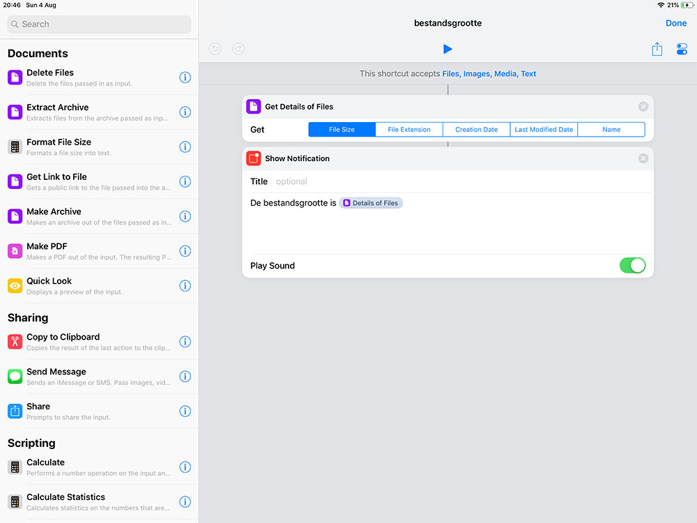 Zoals je zou verwachten zorgt de actie ervoor dat er details van een bepaald bestand worden doorgegeven. Welke informatie dat is, kun je zelf bepalen en in dit geval moet je dus “File Size” selecteren. Nu hoef je alleen nog maar te kiezen hoe je de informatie wilt zien en dat doen we in dit geval met een notificatie. Voeg hiervoor de “Show Notification” actie toe aan je snelkoppeling. Mogelijk moet je Shortcuts even toestemming geven om je wensen uit te kunnen voeren.
