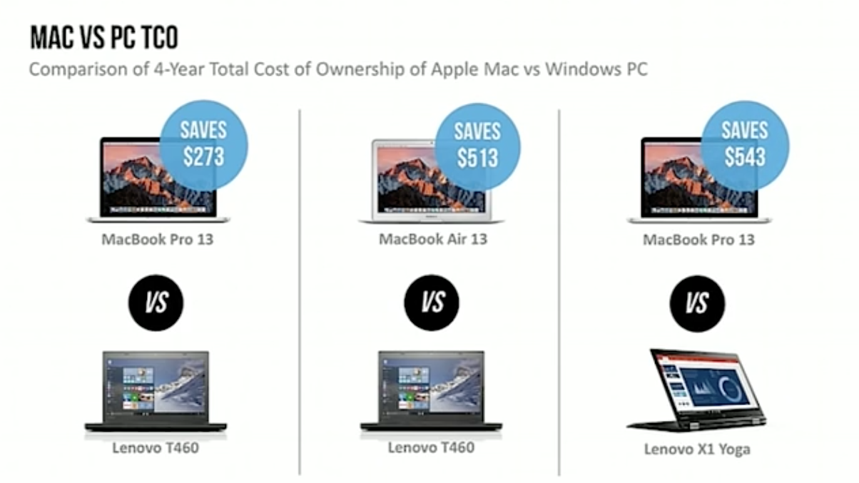 De kostenbesparing bij “Device management” wordt als volgt uitgelegd: macOS heeft met FileVault een ingebouwde mogelijkheid om de harde schrijf te versleutelen, terwijl voor Windows een externe applicatie nodig is. Ook is geen externe anti-virus meer nodig door het in macOS ingebouwde Xprotect. IBM maakt ook niet langer een image die snel outdated is, maar kan door het Device Enrollment Program van Apple de Macs direct aan gebruikers uitleveren en een eindgebruiker de laatste configuratie door middel van een wizard laten doen. Het aantal kritische updates voor de Mac is ook aanzienlijk lager dan voor Windows.