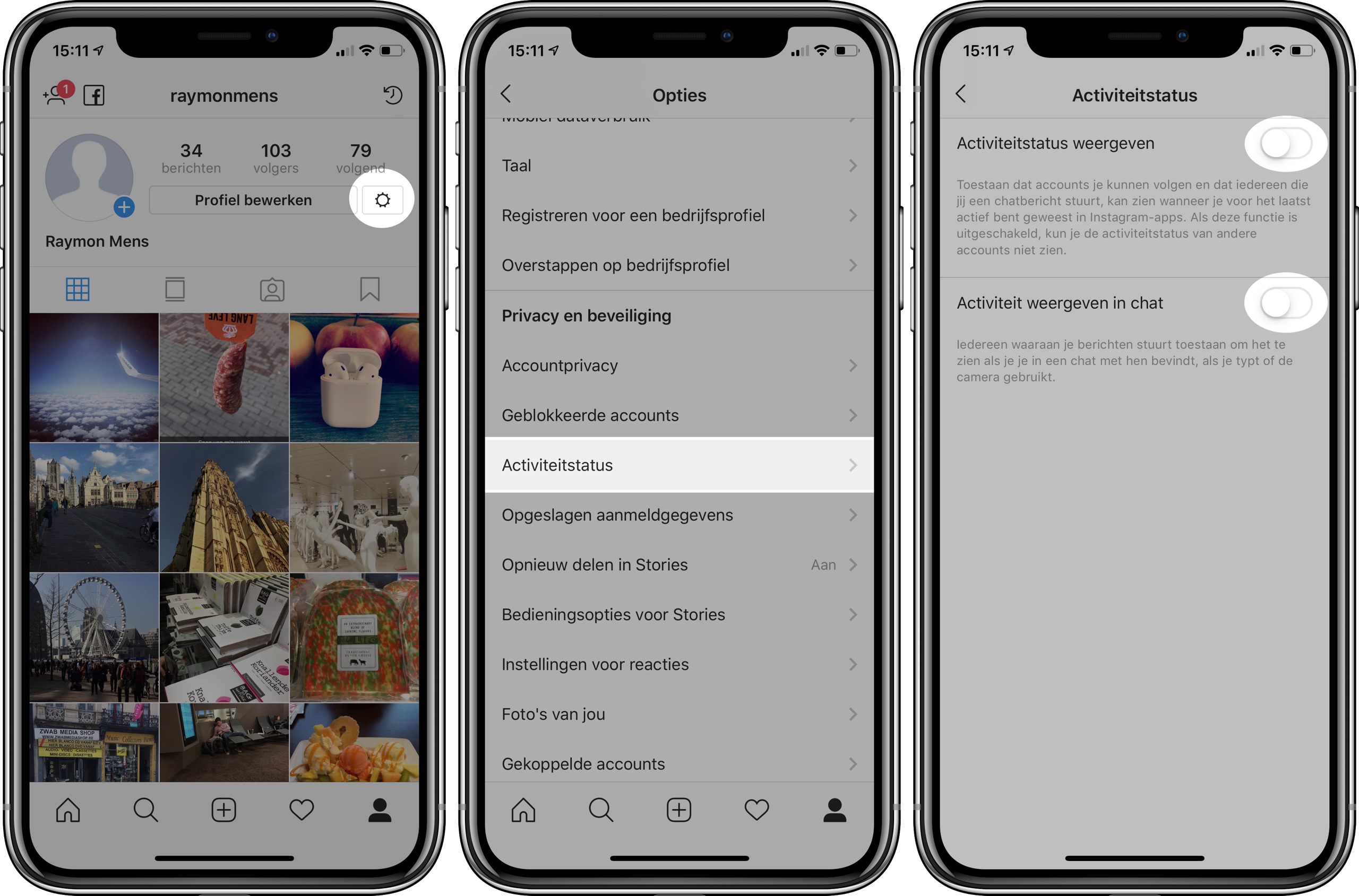 Je kunt uitzetten dat je vrienden en contacten kunnen zien wanneer je voor het laatst actief was op Instagram. Om dit te doen ga je naar je profiel, tik je op het tandwieltje en scroll je een stukje naar onderen. Daar zie je de optie activiteitstatus, waar je het tonen van je activiteit uit kunt schakelen. Dan is er geen groen bolletje meer bij je naam te zien, en zien contacten niet wanneer je voor het laatst actief was.