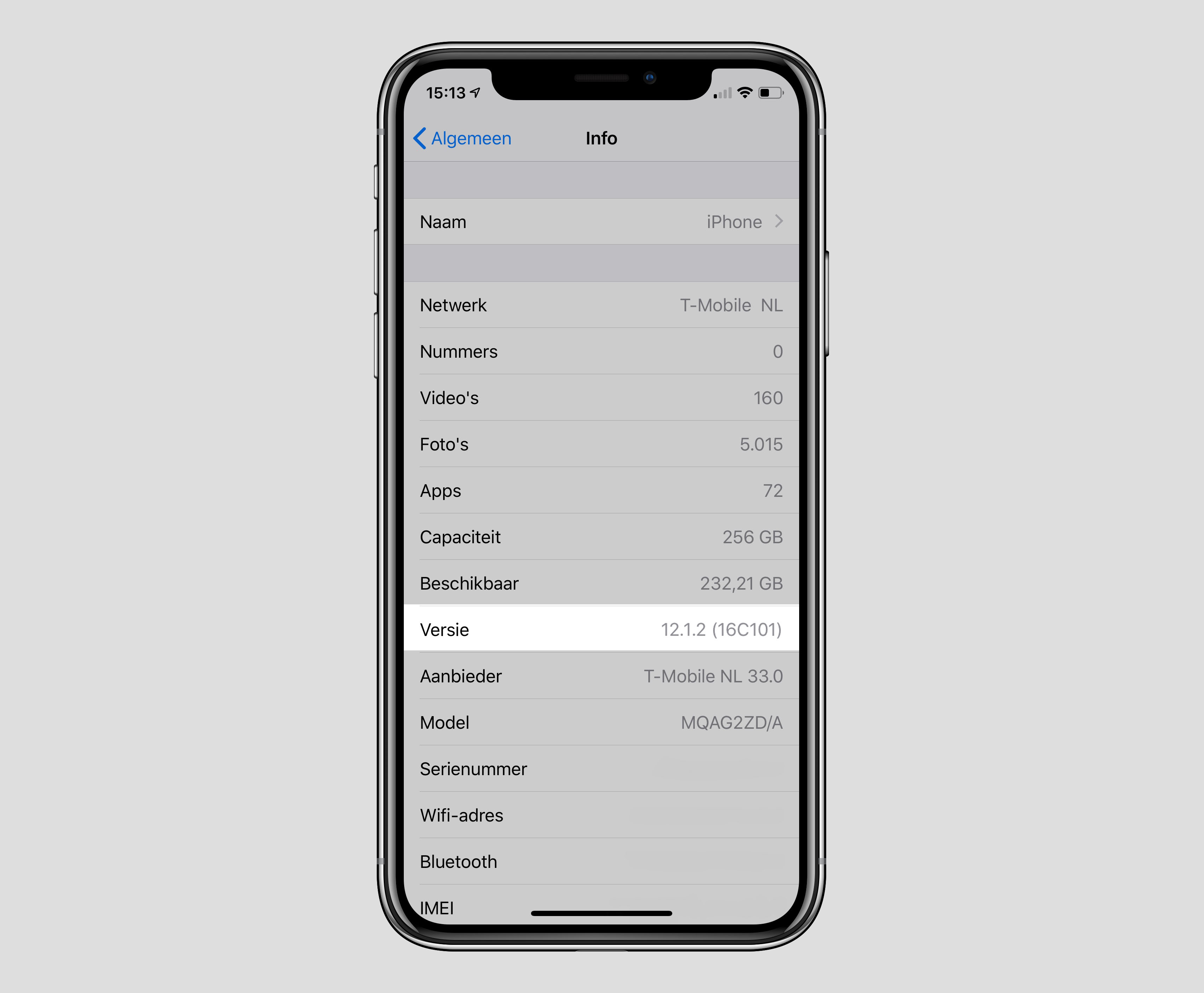 - Scroll naar ‘Versie’. Hier staat je iOS versie. Daarachter staat tussen haakjes het build nummer.