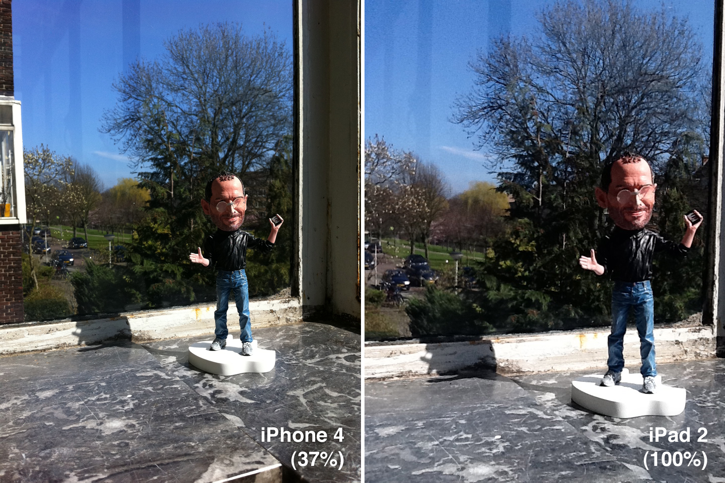 Dat er een camera in de iPad 2 zou zitten wist iedereen, maar de kwaliteit ervan zal even slikken zijn voor sommigen. Het VGA-cameraatje aan de voorkant is alleen bedoeld voor videochatten en voldoet voor dat doel. Apple heeft er echter voor gekozen om ook een camera aan de achterkant in te bouwen. Er kan 720p HD video mee geschoten worden, maar daar is alles dan ook mee gezegd. Het beeld is schokkerig en korrelig (tenzij er veel licht is) en de camera kan niet focussen. Ook deze camera lijkt daarmee vooral bedoeld te zijn om mee te videochatten. Verwacht er in ieder geval geen meesterwerken mee te schieten.