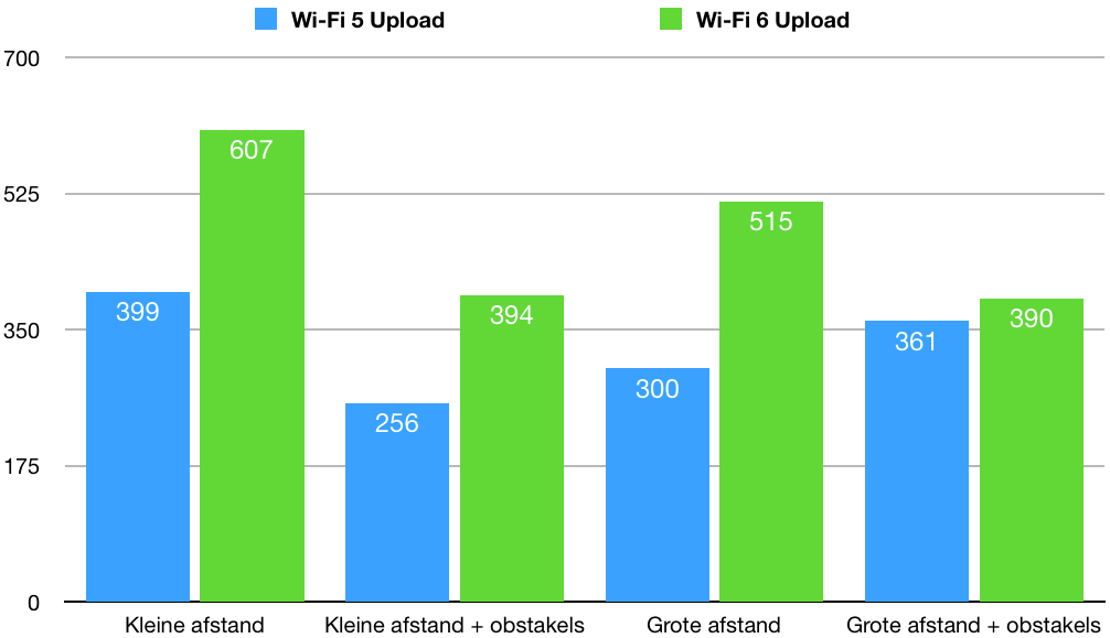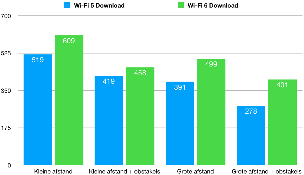 Kleine afstand = zelfde kamer, drie meter afstand. Grote afstand = zelfde kamer, acht meter afstand. Obstakels = achter betonnen muur. Snelheden in mbit/s.