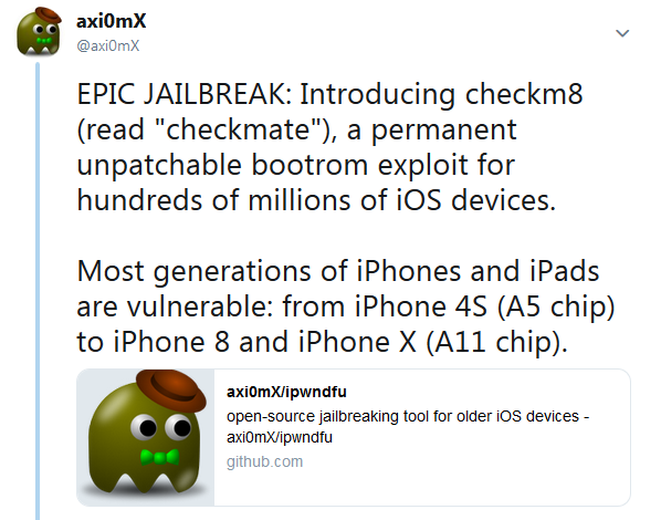 Op vrijdagochtend onthulde hacker axi0mX de exploit ‘Checkm8’ (lees: Checkmate, ofwel schaakmat). De exploit is specifiek gericht op de Boot-ROM in een iPhone of iPad. Het is dus geen lek in de iOS software.