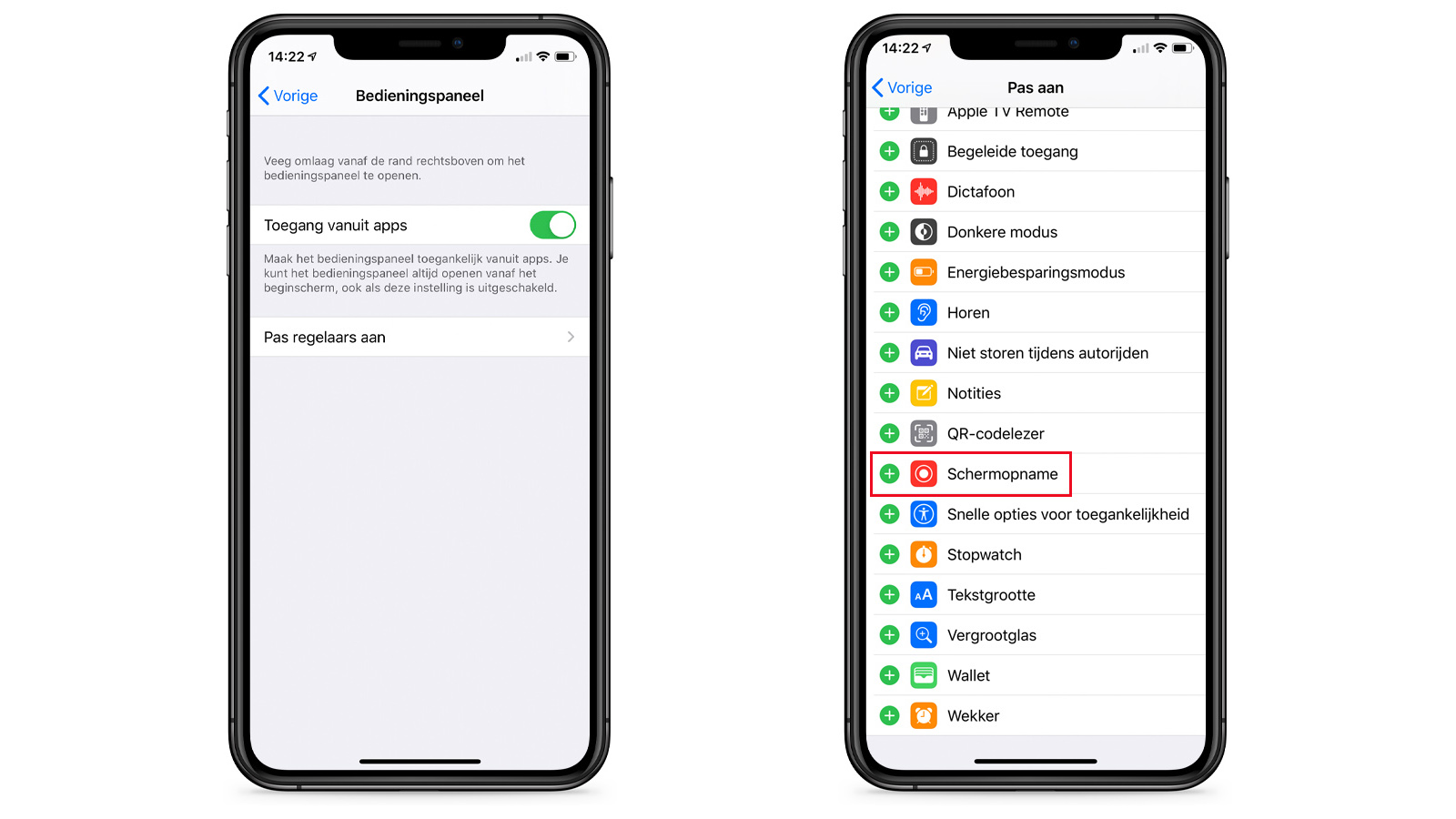 Hiervoor ga je naar ‘Instellingen’ -> ‘Bedieningspaneel’ -> ‘Pas regelaars aan.’ Hier zie je verschillende functies die je kunt toevoegen aan het bedieningspaneel waaronder ook ‘Schermopname.’ Tik op het groene plusje voor deze optie. Wanneer je dit gedaan hebt, kun je gaan beginnen met het opnemen van je scherm.