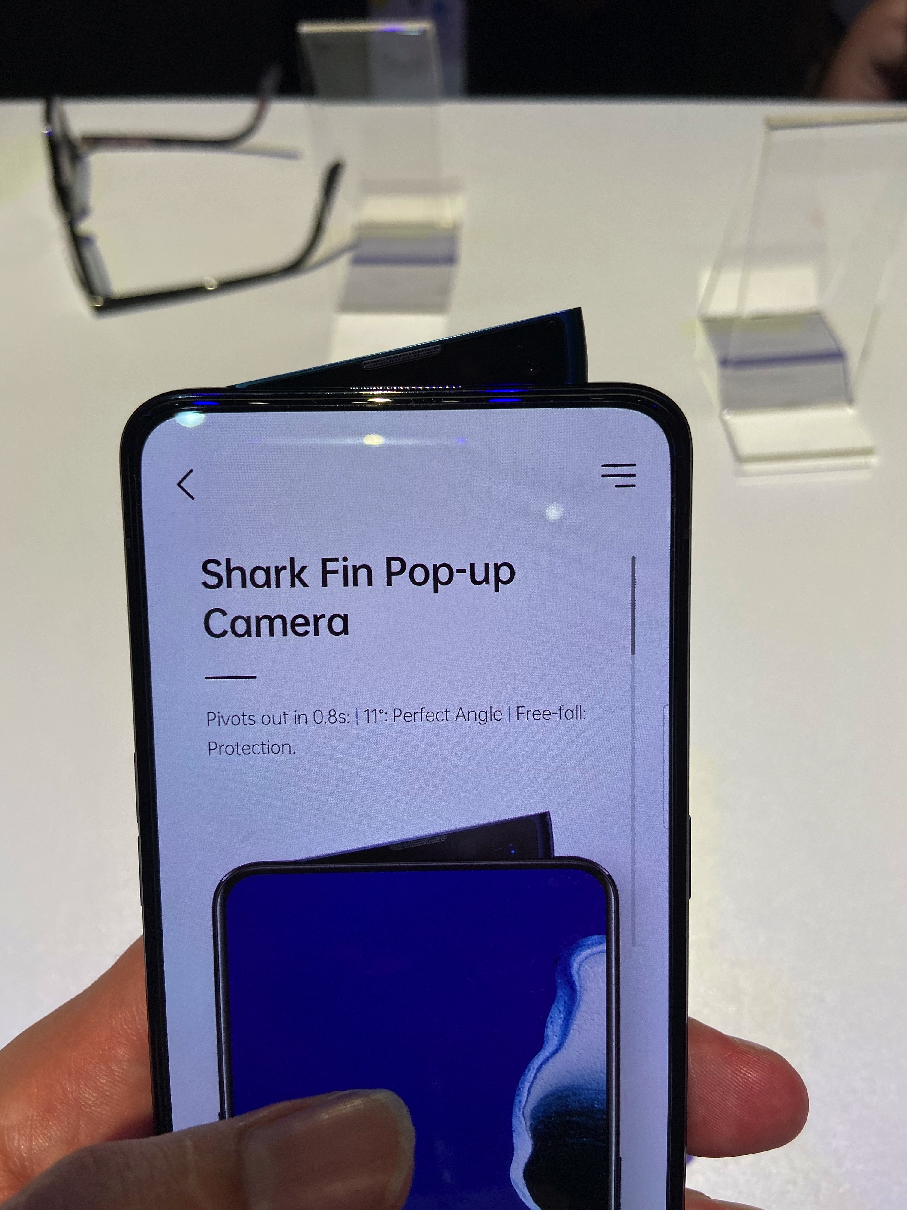 Op de achtergrond zit een quad camera-systeem. De hoofdcamera daarbij is een 48MP camera van Sony. Deze wordt bijgestaan door een 8MP groothoeklens, een 13MP telelens en een 2MP monolens. Het idee van het systeem is dat het kwaliteit levert. Of je nou iets op een grote afstand op de gevoelige plaat legt of juist op een halve meter. Een selfiecamera zit verstopt. Wanneer je een selfie wilt maken, dan komt die omhoog als een soort haaienvin en kun je met een 16MP camera een mooie selfie nemen. Nogmaals, we moeten het even in de praktijk gaan ervaren, maar de eerste indruk is goed. De smartphone lijkt van alle markten thuis te zijn en kan ook foto’s maken wanneer het erg donker is.