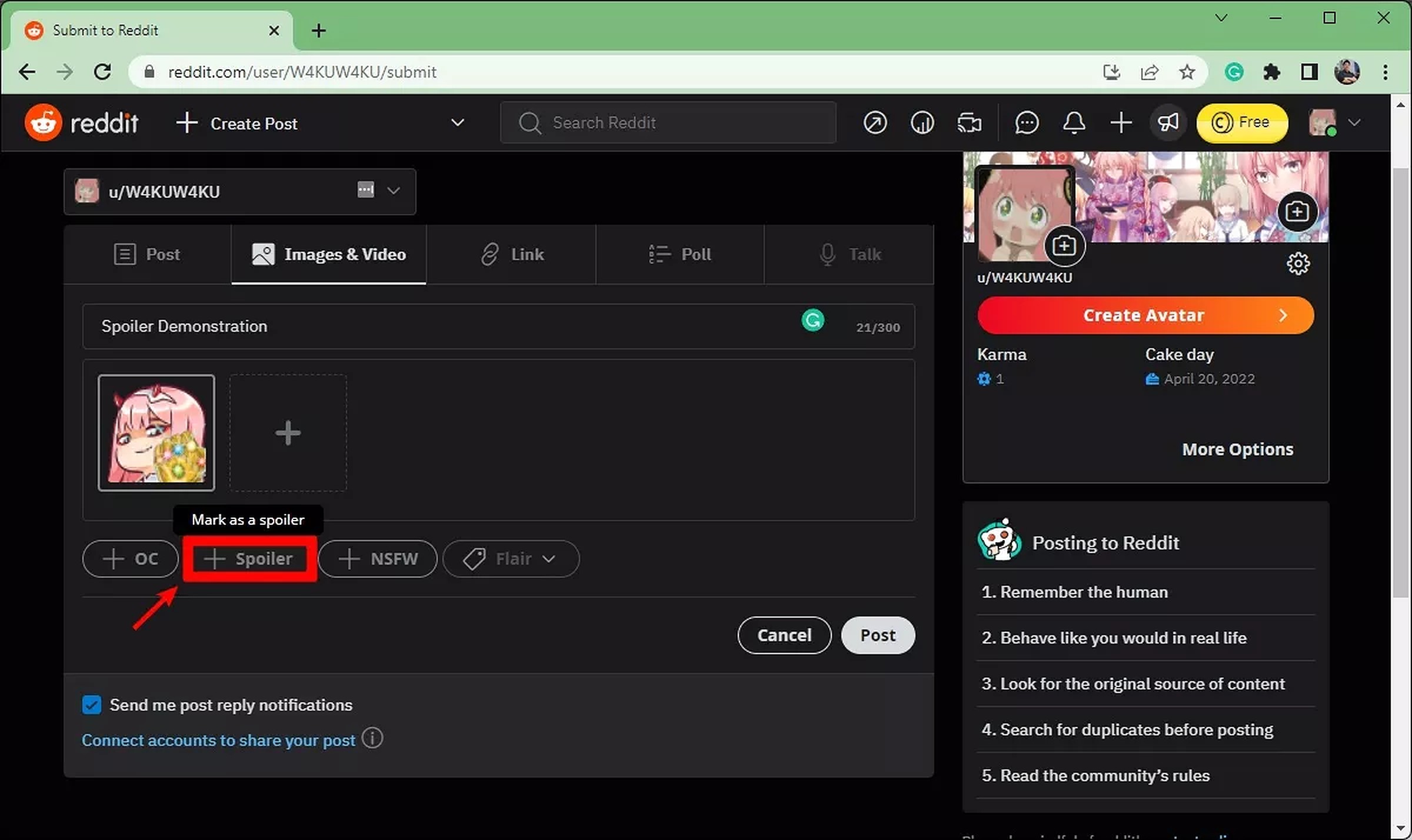 Afbeeldingen en video’s zijn misschien wel de extreemste vorm van spoilen. Dit wil je natuurlijk niemand aandoen, dus dit trucje komt ongetwijfeld goed van pas. Voor het afschermen van tekstposts gebruik je dezelfde methode. Upload de foto of video op Reddit zoals gewoonlijk. Als je dit hebt gedaan klik je onderin het veld op ‘+ spoiler’. Op die manier markeer je jouw post als spoiler. Klik vervolgens op plaatsen.