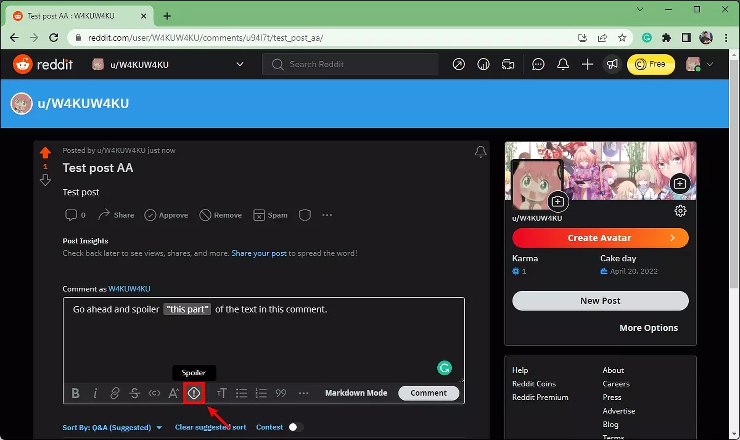 Zit jouw hele comment vol met spoilers dan is het een goed idee om een markdown te gebruiken. Met een markdown zorgt Reddit ervoor dat je hele comment onzichtbaar is, tot een gebruiker erop klikt. Je stelt dit in door op de knop ‘markdown mode’ links van de commentknop te drukken. Typ hierna >! aan het begin en !< aan het eind van de comment. Plaats nu de comment.