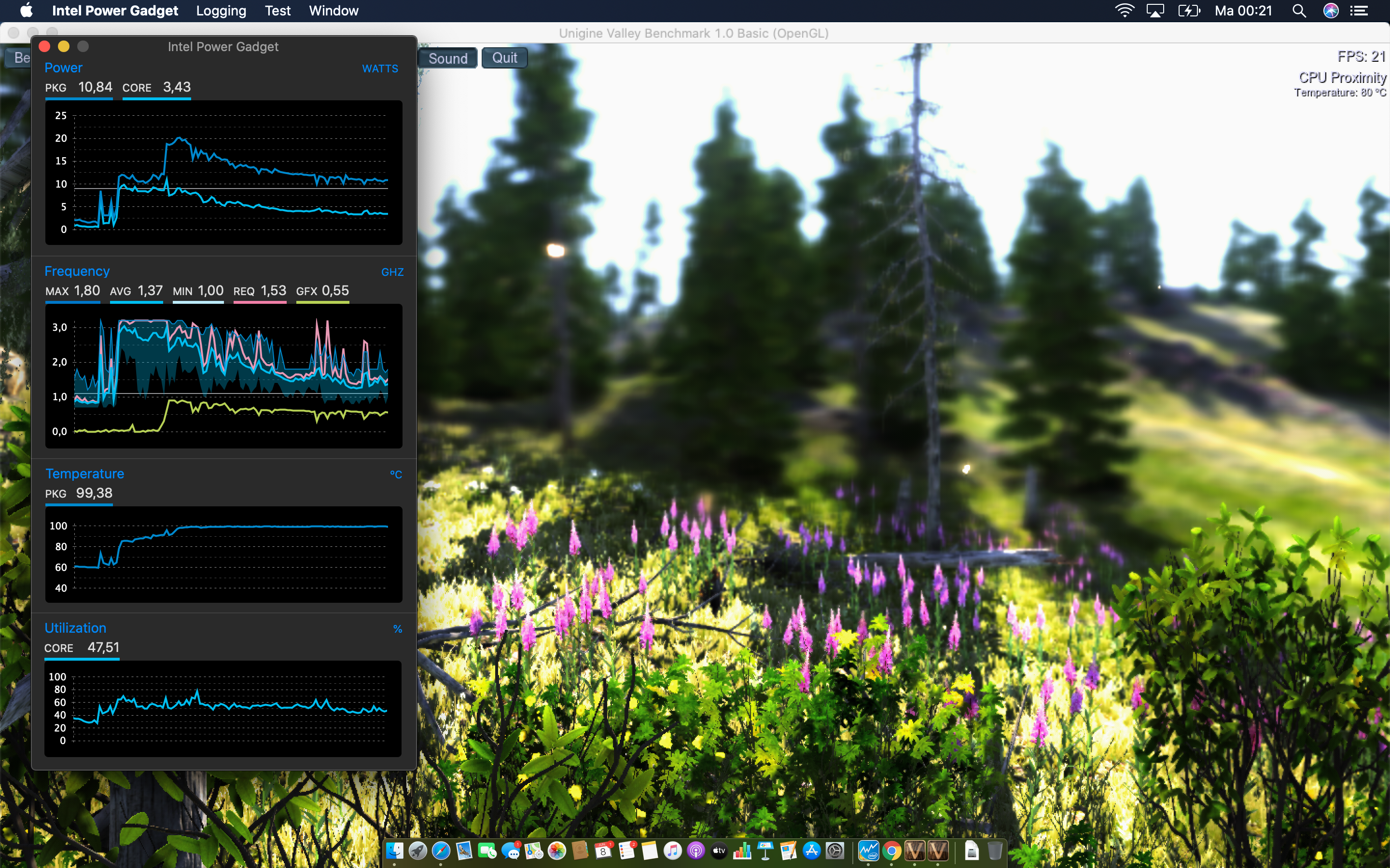 Dat bleek bijvoorbeeld bij de Valley Benchmark die we hebben uitgevoerd. Zodra deze start, klokt de CPU zichzelf naar 3 GHz. Dan heel snel, wanneer de temperatuur het maximaal getolereerde van ~100 graden bereikt, verlaagt de processor de frequentie drastisch. Aanvankelijk keert deze terug naar 1,8 GHz en stabiliseert vervolgens op min of meer 1,2 GHz.