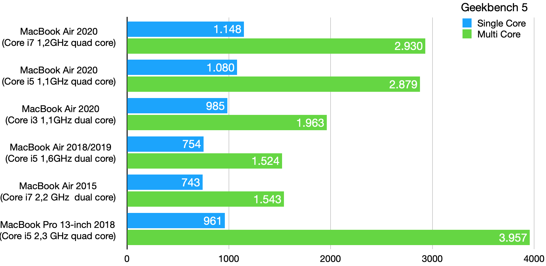 De MacBook Air 2018 en 2019 zagen er een stuk beter uit dan hun voorgangers uit 2015 en 2017, maar echt sneller waren ze niet. Intel heeft nu met zijn tiende generatie processors wél vooruitgang geboekt. In een single-core test was de MacBook Air 2020 met Intel Core i5-chip 52% sneller dan zijn voorganger. Wanneer alle cores gebruikt worden, boekt de nieuwe Air zelfs 85% snelheidsdienst. Ook de instapper met Core i3 presteert ongeveer 30% beter dan zijn voorganger.