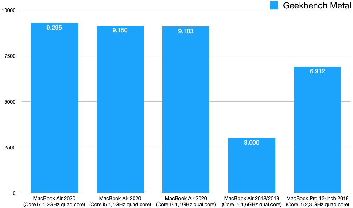 De grafische chip van de MacBook Air 2020 weet te verrassen. Er zit geen losse grafische chip in deze machines, maar Intel Iris Plus Graphics met een maximum van 1.536 MB geheugen. De grafische test op basis van Metal in Geekbench laat een resultaat zien dat driemaal hoger is dan dat van de MacBook Air 2018/2019. Onze MacBook Pro 2018 met zijn Iris Plus Graphics 655 is net zo verouderd en moet in de MacBook Air 2020 zijn meerdere erkennen.