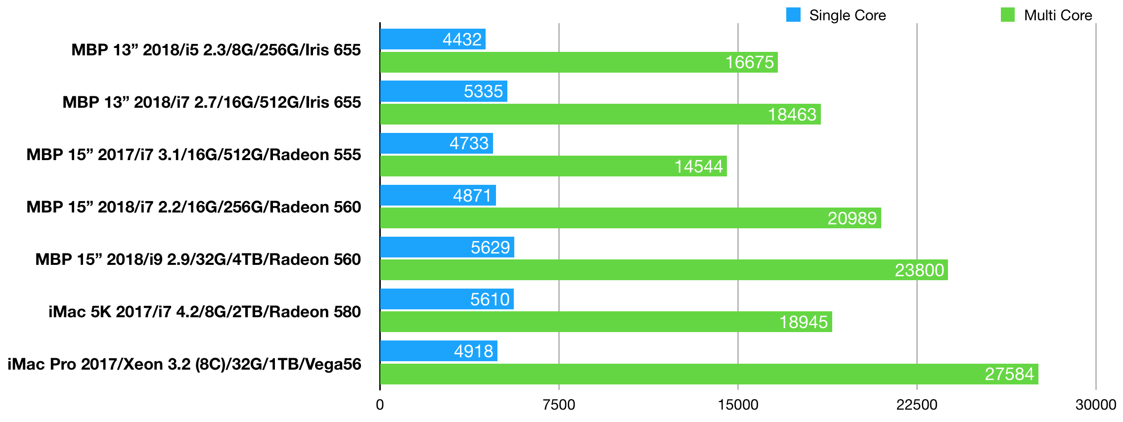 We hebben de prestaties van diverse recente Macs met Geekbench 4 gemeten. Daarbij valt op dat het 13-inch instapmodel van de MacBook Pro 2018 niet onder doet voor de 15-inch MacBook Pro uit 2017 en zelfs bij de iMac 5K in de buurt komt. De 15-inch MacBook Pro 2018 met i9-chip komt zelfs aardig in de buurt van de iMac Pro.
