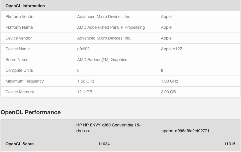 Ondanks het feit dat Rosetta klaarblijkelijk maar vier van de acht GPU kernen gebruikt, blijkt de A12Z Bionic GPU in een OpenCL-test nog steeds krachtig genoeg om een aantal native GPU’s te verslaan. Zelfs met de Rosetta2 vertaalslag komen de resultaten van de GPU in de A12Z uit, ergens in de buurt van bijvoorbeeld de Ryzen 5 4500U en de Core i7-1065G7 iGPU’s. Sterker nog: de A12Z Bionic heeft beiden overtroffen.