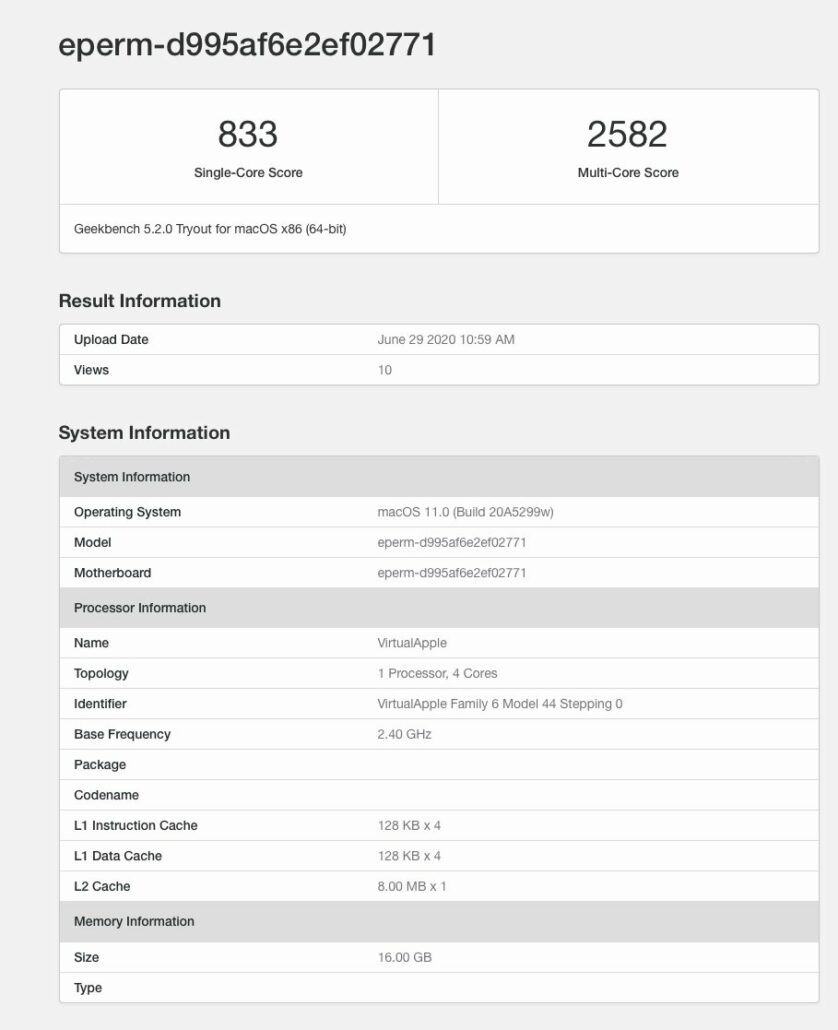 Zoals te verwachten houdt het doorlopen van Apple’s vertaallaag Rosetta2 in, dat er enig prestatieverlies zal optreden bij het uitvoeren van macOS 11. Dat is ook terug te zien in eerder gelekte benchmark resultaten: