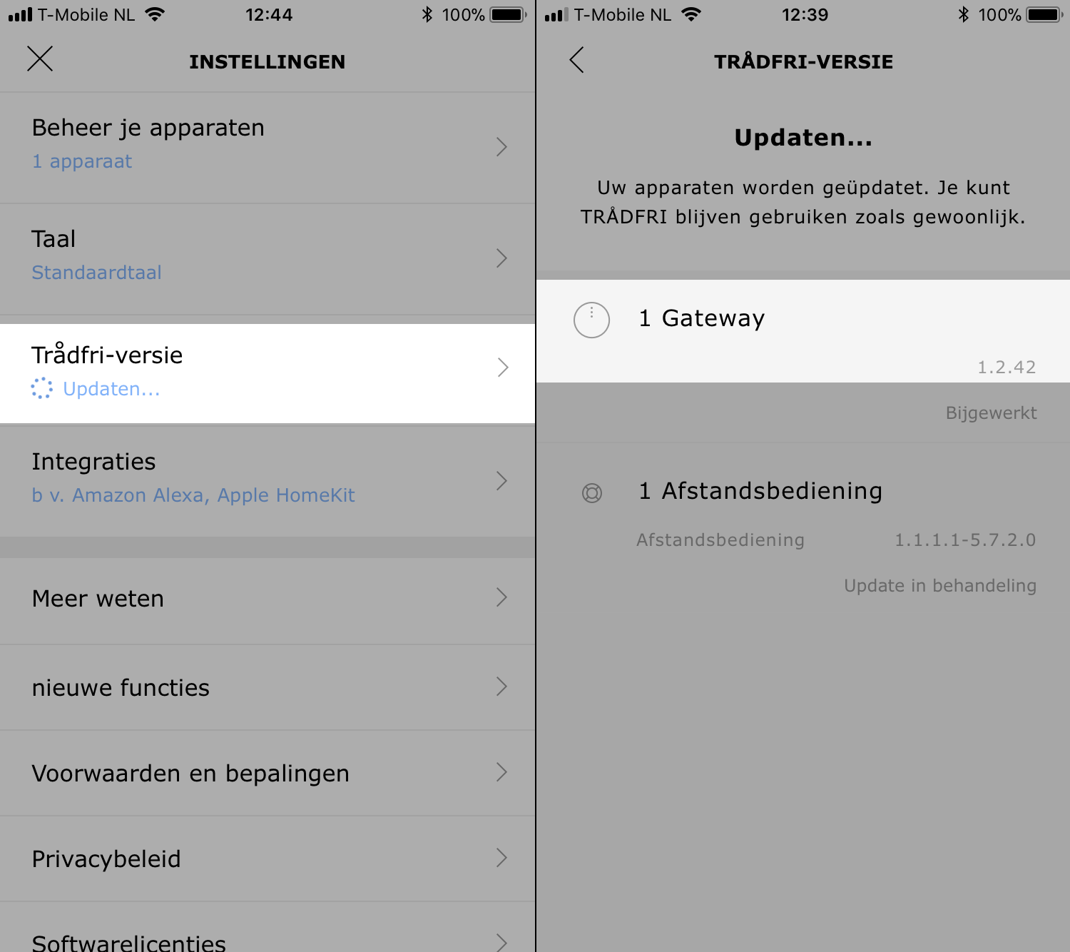 Het updaten van je gateway gaat als volgt: Open de Trådfri-app, kies voor Instellingen en vervolgens voor Trådfri-versie. Indien je gateway versie 1.2.42 aangeeft, ben je klaar voor HomeKit. Staat er een oudere versie? Dan dien je de update handmatig te starten. De meeste gateways zouden automatisch moeten starten met het installeren van de update.