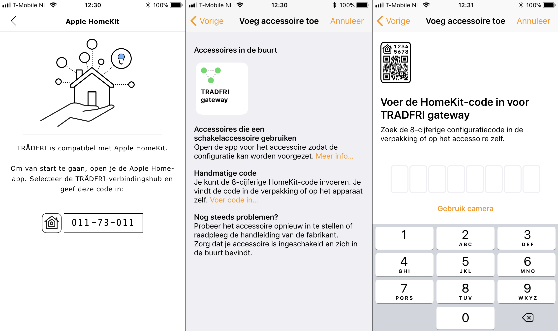 Om met HomeKit te koppelen, heb je een code nodig. Deze is in de Trådfri-app te vinden onder Instellingen → Integraties → Apple HomeKit. Schrijf de code op en open vervolgens de Woning-app van iOS. Ga naar het tabblad Woning en kies het plus-icoon rechtsboven, daarna tik op je Voeg accessoire toe. Nu zal de Trådfri gateway verschijnen. Tik deze aan, voer de code in en je IKEA-lampen zijn succesvol met HomeKit gekoppeld.