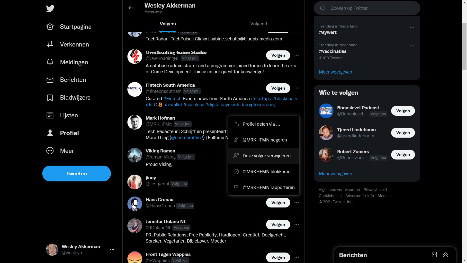 Een soft block uitdelen op Twitter gaat gelukkig heel simpel. Je gaat naar je lijst met volgers en zoekt de persoon op die je van je volglijst wil halen. Klik op de drie puntjes aan de rechterkant en selecteer de optie voor het verwijderen van de volger. Die optie wordt ‘Deze volger verwijderen’ genoemd (zie afbeelding).