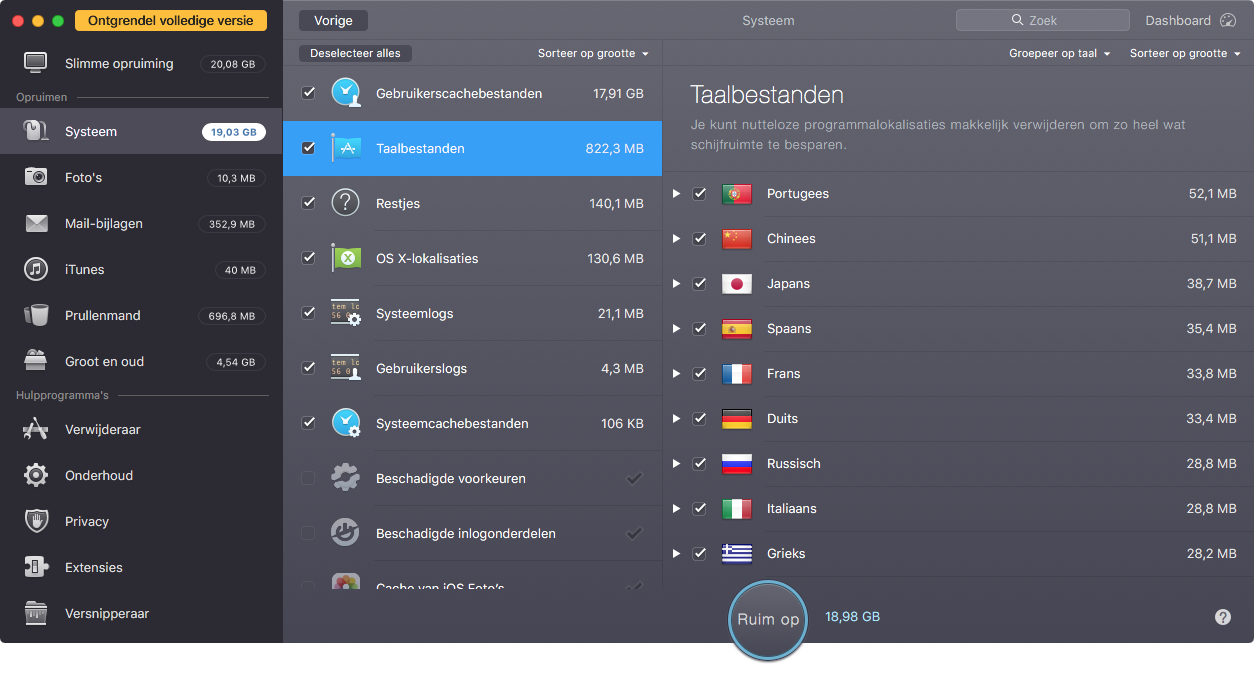 CleanMyMac presenteert zich als software die helpt bij het monitoren van de technische staat van je Mac en het opruimen van onnodige bestanden. Die claims worden waargemaakt en de interface is overzichtelijk. Op onze Mac kon CleanMyMac 21GB vrijmaken. De interface toont een overzicht in grote lijnen, maar het is ook mogelijk om individuele onderdelen uit te schakelen en te bekijken welke mappen en bestanden opgeruimd worden. Beter dan de concurrentie doet CleanMyMac het overigens niet, op dezelfde Mac wist CCleaner (gratis) ook 19GB aan overbodige bestanden te vinden.