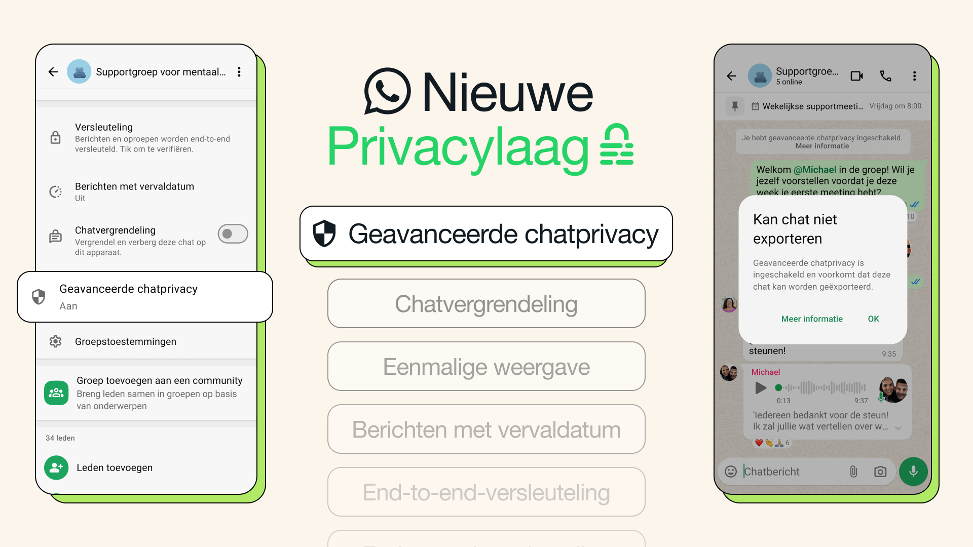 Geavanceerde chatprivacy is de nieuwe beveiligingslaag van WhatsApp. De instelling staat in het overzicht van een privégesprek of groepsapp. Door het aan te zetten, kunnen andere mensen de chat niet meer exporteren. Zo wordt je content niet meer buiten de app gedeeld zonder dat jij er wat vanaf weet. WhatsApp zegt dat het de feature in de toekomst gaat uitbreiden met meer controle.