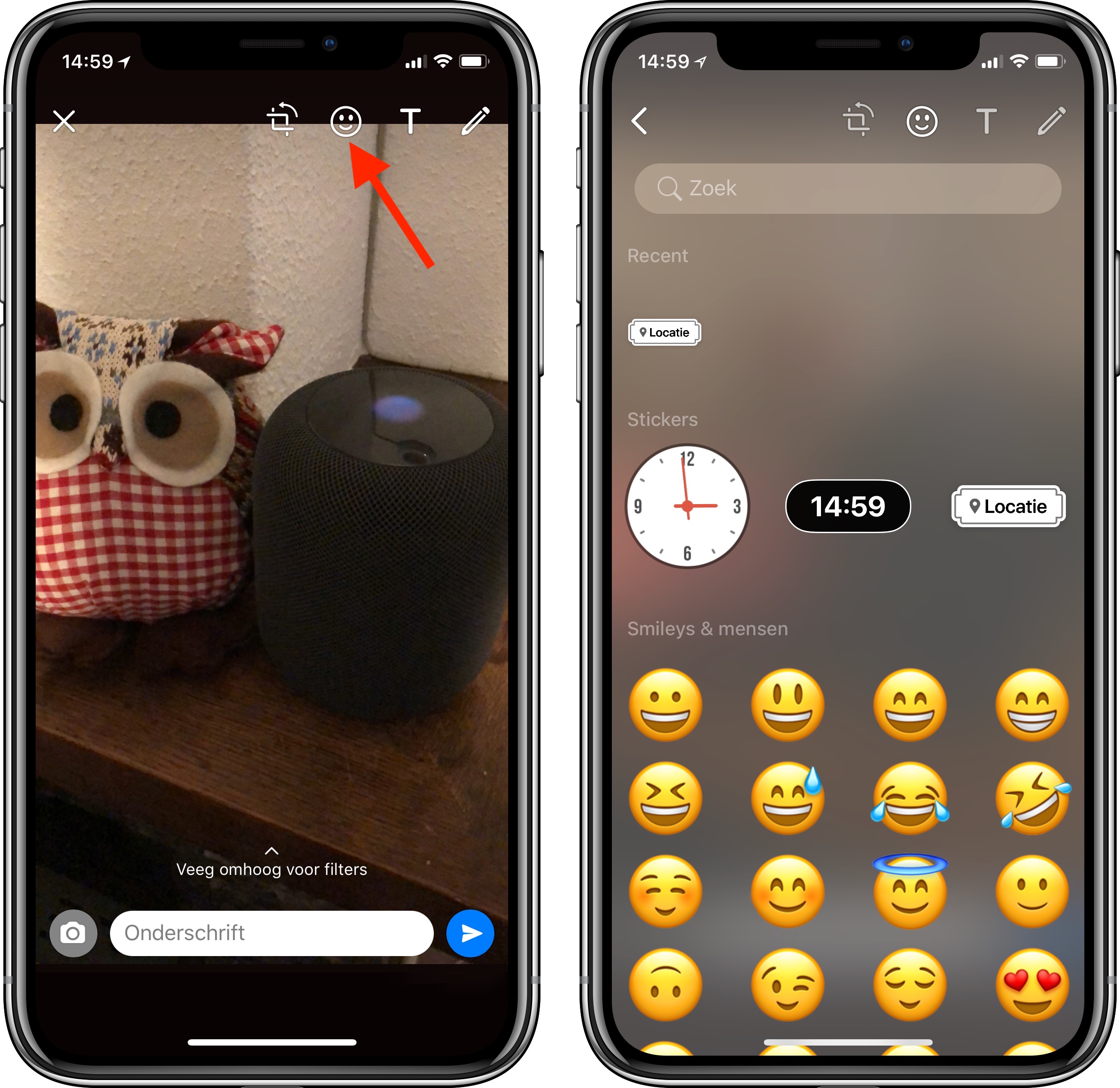 Een sticker toevoegen is erg simpel. Je kiest eerst de foto die je wil versturen, of maakt een nieuwe foto. Daarna tik je op de smiley bovenaan en krijg je het menu met stickers. Momenteel is er slechts de keuze uit een analoge en digitale klok of je locatie. Je kunt echter ook emoji als sticker gebruiken.